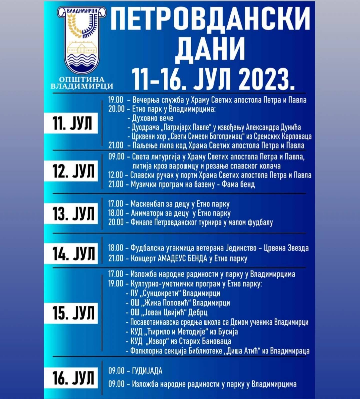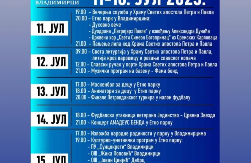 ПЕТРОВДАНСКИ ДАНИМанифестација „Петровдански дани“ ГУДИЈАДА Гудијада 16.07.2023. You Might Also LikeГУДИЈАДАПЕТРОВДАНСКИ ДАНИ У ВЛАДИМИРЦИМА 2021Петровдански дани 2019. Духовно вече ВЛАДИМИРЦИ ДАН 1 ВИДЕОComments are closed.